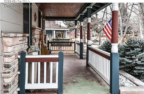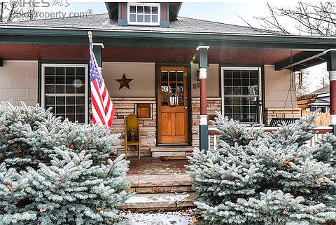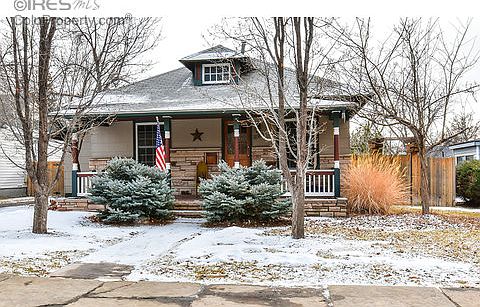 Sweetly spruced-up Bungalow just blocks from historic downtown Loveland on large lot complete w/10' tall wooden sculpture. Covered porch welcomes w/decorative detail. Front door opens to living room w/window seat, built-in shelves & drawers, keystone trim. Kitchen reveals hand-crafted cabinets & incl all appl; dining room. Three bedrooms. one full bath w/laundry. Root cellar (120 sq. ft) great for storage. Abundant summertime flowers, Flagstone patio, separate dog run, and large shed/workshop.