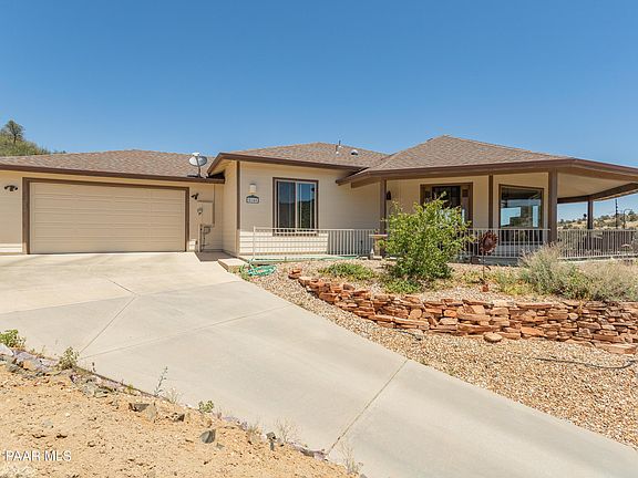You must see this unique home!!! Before you even enter the home you'll fall in love with the views! Mingus, SF Peaks, the Bradshaw's and everything in between can be enjoyed from the huge wrap-around covered patio. Once inside your friends will admire the large rotunda great room with high open beam ceilings and large windows to enjoy those views. The bright, open floorplan features a 3-sided fireplace with floor to ceiling stacked stones. You will want to cook and converse in this kitchen with the solid countertops and large eating bar, upgraded cabinetry, custom range hood and pantry. There is more storage in the large laundry room with a large sink and plenty of cabinets. The luxurious master suite features a large tub and snail shower with rain head. Much more- see supplement This home has all the most requested features- views, no hoa, large deck, split floor plan, bright open living area, and large kitchen and laundry with lots of storage. The huge wraparound patio can be accessed from the entry, dining room or master bedroom. There are many other features, like the custom lighted glass shelves by the built in entertainment center, built in surround sound, art niches in several rooms (some lighted), and ceiling fans in the great room and all bedrooms. All this is a very desirable subdivision with no HOA and a great location near shopping and other amenities. Oh, did we mention the views?