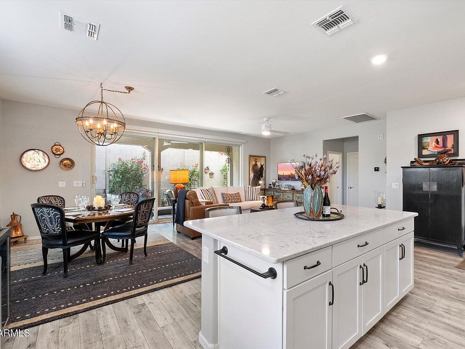 This stunning single-story home seamlessly blends modern design with the tranquility of the desert landscape. A welcoming façade leads to an open-concept floor plan featuring soaring 9-ft. ceilings and a spacious great room, creating an airy and inviting atmosphere. Expansive 15-ft. sliding glass doors, adorned with custom electric linen blinds, open to an extended covered patio, offering a seamless indoor-outdoor living experience. Surrounded by beautiful mature landscaping and a drip irrigation system, the backyard is a peaceful retreat for relaxation and entertaining. The heart of the home is the expansive kitchen, showcasing Timberlake 42-in. upper cabinets, sleek quartz countertops, and a generous center island—perfect for gathering and culinary...CONTINUE READING... ...creativity. The home's contemporary aesthetic is enhanced by stylish laminate wood-style flooring that flows throughout, adding warmth and sophistication to every space. Designed for privacy and comfort, the split floor plan situates the master suite at the back of the home, offering a serene retreat with a spa-inspired bath. Indulge in the oversized walk-in shower with a bench seat, while the walk-in closet provides ample storage. Each additional bedroom also features its own walk-in closet, ensuring space and functionality for all. Luxury details elevate this home, including Sherwin-Williams® two-tone paint, premium Kohler kitchen and bath fixtures, and upgraded lighting throughout. Every inch of this residence has been thoughtfully curated to offer modern elegance and effortless desert living. This is truly a gem!