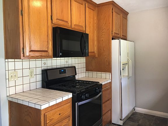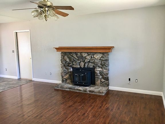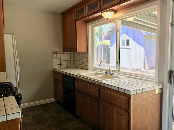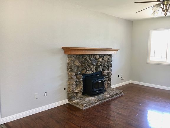 Charming updated home situated in great central location. Super convenient to shopping schools and parks. Step into family room with updated floors, cozy fireplace w/ wood stove. Kitchen with oak cabinets, tile counters in new stove and great views of yard/patio. New carpet and fresh interior paint. Update bath. Backyard with spacious covered patio larger yard and fantastic storage building that can easily be converted to office. Other great feature is 4th bedroom in converted garage.