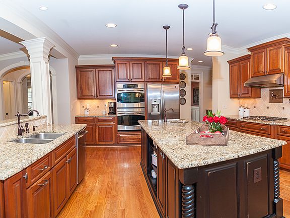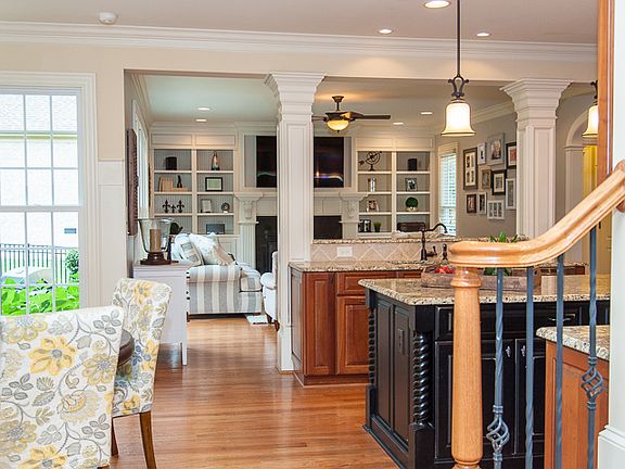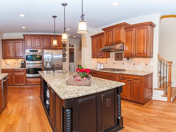 Stunning custom-built North Raleigh home in Chestnut Oaks offers ultimate in privacy with flat, professionally landscaped 0.89-acre lot. Fully fenced backyard abuts undeveloped wooded acreage. 5 BR, 4 BA, 2 half baths, including a downstairs guest suite. Open concept family room, chef’s kitchen and breakfast area includes gas fireplace with marble surround, all stainless appliances, granite countertops, double oven, 5-burner gas cooktop, Sub-Zero wine fridge and huge center island with prep sink and disposal. Additional living spaces include a formal living room, formal dining room, bonus room and 3rd floor media room. Front and back stairs lead to 2nd floor. Oversized, side-load 3 car garage, mud room, OnQ panel for easy access to home networking, cable, phone and satellite feeds, security system, Rinnai exterior-mount tankless water heater with recirculation pump (2013), Kinetico water softener (2013), 3-zone HVAC, 11 zone irrigation system, sealed crawlspace, screen porch, patio.