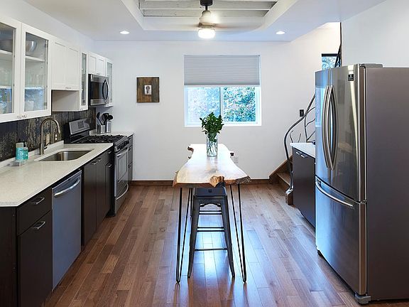The main level enters into an open concept - living room, kitchen and dining area. Second floor has one bedroom with a queen bed and a full bathroom with washer and dryer. Third floor is a bonus loft space. Lower level has a full on-suite bathroom, queen bed, and walk-out access to a fully enclosed backyard lounge area so you can enjoy your morning coffee or a late night drink.