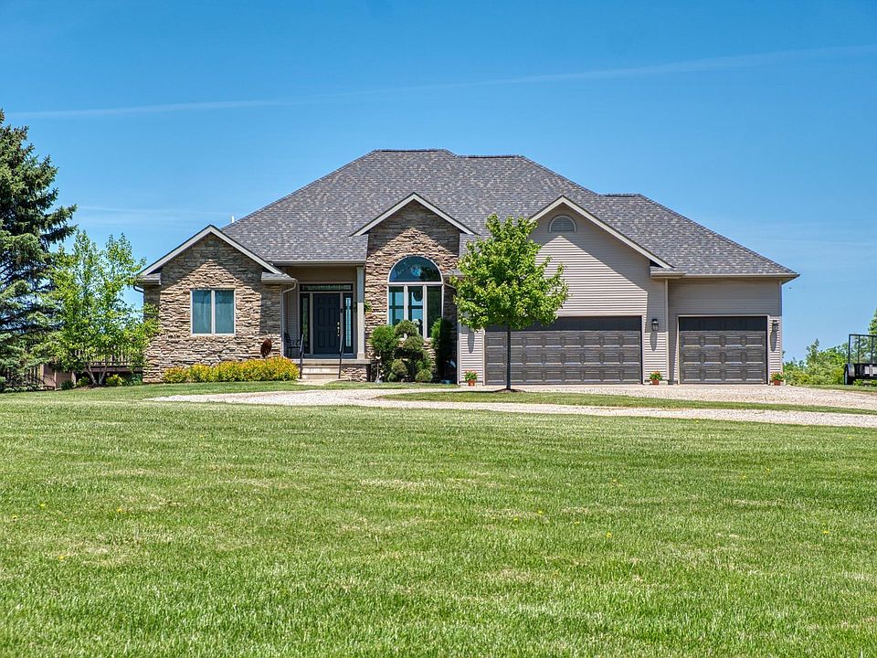 OPEN HOUSE! Sunday, June 4 from 2pm to 3:30pm! CALL instead of hitting the contact agent button on those websites! - Absolutely perfect ranch on Lake Leslie in Corunna! Beautiful open floor entry with dining and great room overlooking the lake. Stunning maple floors with black walnut inlay throughout the main floor. Huge windows, positioned on the entire back of the home, offering views from all the living areas and primary suite. Nice white kitchen with granite tops and island, tiled splash, dinette and pantry, leading to cozy living area with gas fireplace and office nook. Main floor laundry, conveniently tucked off the garage entry with utility sink and folding counter. Main floor primary suite with lake views, private access to the deck, walk-in closet and huge bath with skylight, custom tile, soaking tub, walk-in shower and nice granite vanity space. The walk-out lower level features a kitchenette, rec-room, den area with another fireplace and dinette, all overlooking the water and yard. This area also houses another 2 bedrooms, another full bath and an office. Fantastic storage. And the sauna stays too! And the property... On over 2.5 acres with lush landscaping, and well-maintained lawn, nice hardscape with 2 decks, a patio built for entertaining and stone pathway to the dock. Above ground heated pool! 3-car attached garage plus extra detached garage (BOTH heated) and so much more! This one has been maintained and updated like new!