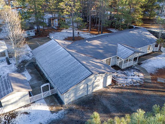 Fresh exterior paint on home and outbuildings!! This exceptional ranch-style home boasts 4 bedrooms, 2 bathrooms, and spans 1780 square feet, nestled on approximately 0.95 acres of land. There are countless noteworthy features to highlight - from its large living room, split living layout to the charming pine wood floors, spacious kitchen, and dining area, to the generously sized laundry room with a large pantry. The built-in bookshelves in the living room offer a convenient and inviting space to curl up with a good book and enjoy a great seating area. The attached oversized garage offers ample storage space with numerous cabinets, while the outdoor space features paths and walkways, several outbuildings, wood storage, and an RV cover. The property is conveniently situated on a .95 + or - corner lot just off paved road and close to many recreational areas! Really must see to appreciate!