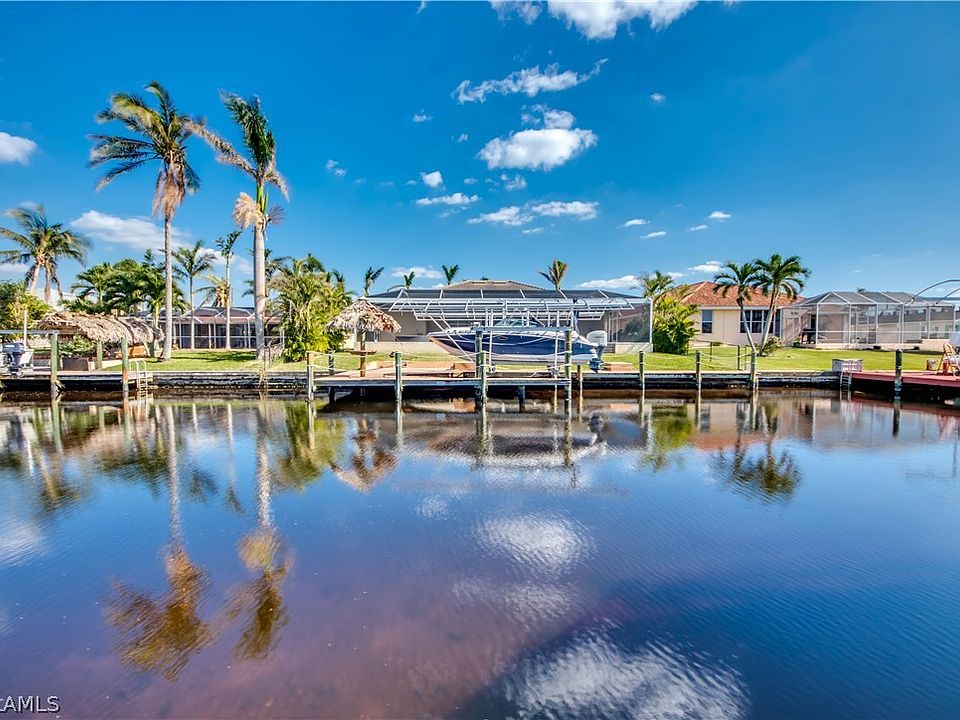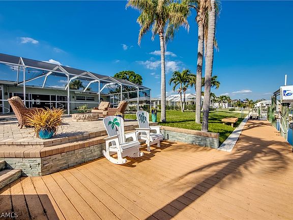 Beautiful, quiet street of $500k - $1M sailboat access homes. Great Yacht Club location for serious boaters wanting fast access to the Gulf of Mexico. Around the corner from the Bimini Basin home of the renown Christmas boat parade. This amazing waterfront location has an oversize lot with 100’ of seawall. Your new home includes a full length, composite Captains walk with two boat lifts (10k & 4k). A 2009 27’ Polar center console boat with twin Yamaha 250’s available separately. You’ll enjoy great times at the camp fire at the pavered patio fire pit. Perfect for our beautiful Florida weather! On the lanai you’ll love the modern, oversize swimming pool with waterfall spa, pavered pool deck & mansard cage. Includes generator hook up & new electric panel. Easy bike ride to the Yacht Club amenities (tennis, racquetball, public pool, beach, marina & more). Short drive to Sanibel, Ft Myers Beach, airport. Bring your BIG BOAT & FISHING POLES or buy the Sellers! This home damaged by Hurricane Ian, remediated & sold AS IS. Cash offers or Rehab/construction loan only. Great potential for your new home … BOATER READY!!