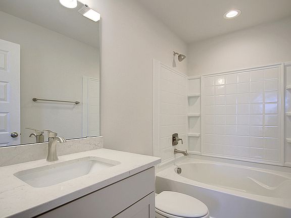 MOVE IN READY! The Dunlin floor plan brings luxury and functionality to a charming home plan. This open concept home allows for a line of sight from the front private cul-de-sac, to the backyard. The kitchen cabinets are an icy Glacier Grey, illuminated with three Payson Brushed Nickle hanging pendant lights. The cool toned cabinets, stainless steel kitchen faucet, backsplash, and Pearl Jasmine Quartz countertops make for a GORGEOUS kitchen! Walk-in laundry room and powder room round out the downstairs living space. French Doors with interior blinds lead to the outdoor covered patio. The upstairs owner's retreat features a tray ceiling, a rectangular bathroom vanity, and upgraded brushed nickel plumbing fixtures. Laminate, ceramic tile, and carpet flooring. Blinds included. MOVE IN READY!