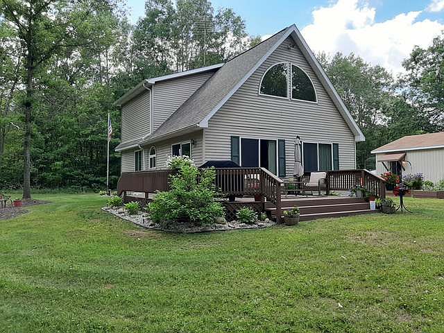 Peace and Tranquility surrounds this beautiful country home. Well maintained 3 bd , 2 bath chalet style home, updated interior with appliances, flooring, paint, new furnace and central air. Beautiful landscaping accents the large open deck.Garden area for fresh produce. Insulated 30x40 pole barn. 51 wooded acres with trails, food plot, blinds and small pond.