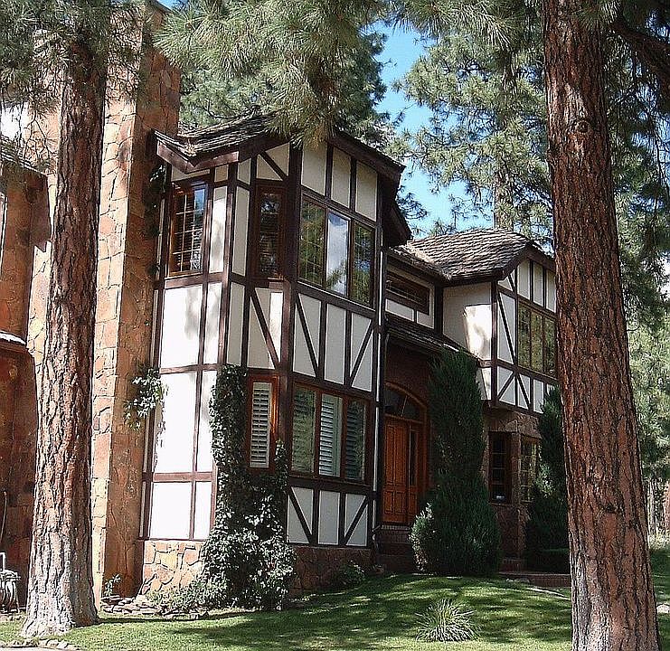 This is one of the most beautiful homes in Flagstaff. This beautiful two story Tudor style home sets on the most prized 3 acres of Ponderosa Pine and Gamble Oak covered horse property in Northern Arizona. It abuts the National Forest next to the Schultz Pass road national forest gate. Schultz Pass being one of the most scenic roads in all of Arizona nestled at the base of the San Francisco Peaks. The entry is through two brick pillars with coach lighting and curves around 250 feet of concrete driveway to the stone covered three car garage. Going up the brick walkway, you are met with the massive custom oak entry doors with solid brass accessories, side windows and arched windows over the doors and framed by brick. Entering the home is the inside two story chandeliered and skylighted foyer with curving stairway. The bottom floor of the home is all hardwood oak floors in the library, great room and dining room with Saltillo Tile in the huge kitchen and laundry room and ceramic tile in the bathroom. The library hosts ample custom solid oak book shelving and a bank of 5 windows forming a bay window to the front of the house. The dining room is also off the foyer to the left and provides ample seating for 8-10. The dining room has a gorgeous wood burning or gas fireplace and a matching bay window. Entry into the dining room and the library is through double oak sliding pocket doors. The huge great room has a bank of windows on both east and west sides. On the north side is a massive stone fireplace that takes up almost the full wall. To the left is the full gourmet kitchen with an L shaped center maple topped island, granite and tile countertops, solid oak cabinetry, Saltillo tile floor and a professional six burner and griddle topped Wolf stove surrounded in a brick arched enclave . The laundry and mud room has a ceramic laundry sink, tile countertops, Saltillo tile floor and floor to ceiling pantry. Next to the laundry is the full downstairs bathroom with ceramic tile, fully tiled shower for two and a separate toilet room. Going up the curved oak stairway to the second oak floored landing there are double doors to the left that lead to the immense master bedroom lighted by a full bay window to the east and a central skylight. A seating area on the east end of the bedroom provides for a couch, chair and desk area. There is a full floor to ceiling stone wood burning fireplace. To the west of the bedroom is an open arch that leads to the skylight lit bathroom with jetted tub for two, full shower, dual sinks and a separate toilet room. There is floor to ceiling oak cabinetry for linen storage. The bathroom has a double bank of windows overlooking the forest to the west. On the north side of the bathroom is a pocket door leading into the walk-in closet with a center drawered podium. Going back out on to the landing are two additional bedrooms separated by a full bath with ceramic tile and oak cabinetry for linen storage. The full three car garage has cabinetry for storage and a workshop area with ample storage for tools. The garage also contains the water softener, downstairs furnace closet and water heater. The water heater is interconnected to the Rinnai tank-less water heater in the upstairs service closet. There is also the pressure tank system for the private well. This provides pressure to the water system as well as water to the emergency water system situated on the roof of the house in the event of a forest fire. The home is surrounded on 3 sides by a beautiful emerald green lawn and has a huge split level redwood deck with a matching redwood picnic table with adjustable back rests that seats 12. The private well provides 9-12 gallons per minute and the water is stored in a 1500 gallon underground cistern tank that pumps water into the pressure home's water pressure system. This home MUST be seen to fully appreciate it.