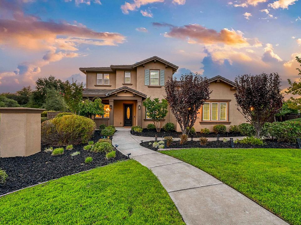 Welcome to this spacious home, tucked in a Granite Bay cul-de-sac, this 5-bedroom, 4.5-bath home offers private access to the schools behind the property and is just a golf cart ride to Granite Bay Country Club. The backyard sets the stage with two expansive covered patios, tiled entertaining space, wide concrete walkways, and a huge lawn framed by mature trees and fresh black barkperfect for play or relaxation. Inside, the open floor plan features imperfect smooth walls, modern lighting, a gas fireplace, and a 3-car epoxy garage. The entry includes a library-style front room with built-in cabinets and a formal dining area. The chef's kitchen shines with granite counters, full pantry with coffee station, and Monogram appliances including built-in fridge/freezer, double oven, microwave, gas range with sear pan, and dishwasher. A downstairs junior suite offers a private bath, while upstairs the master retreat boasts dual walk-in closets, spa-style bath with soaking tub, quartz counters, and walk-in shower. Three additional bedrooms include one en suite and two with a Jack and Jill, plus laundry.