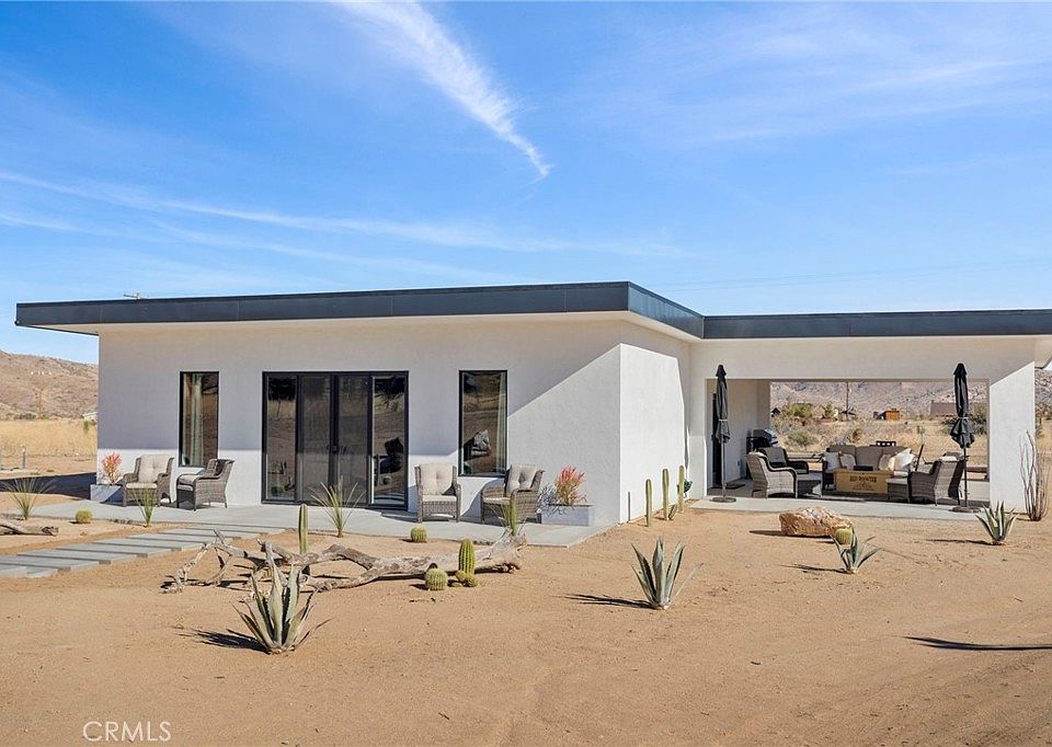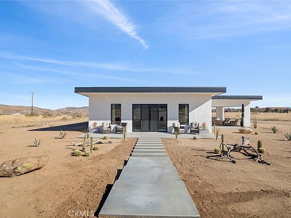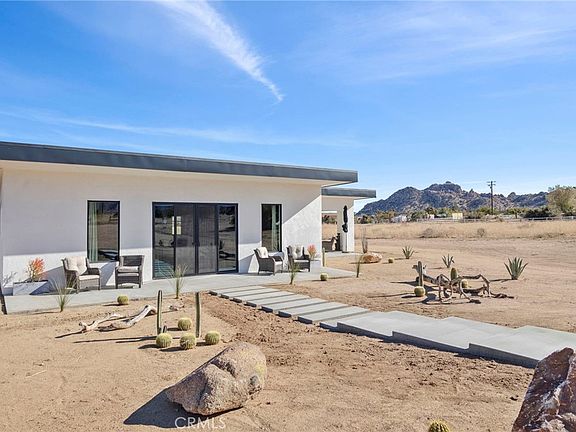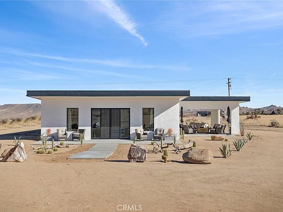 Welcome to Tom Mix Road, a striking architectural desert retreat located just a short distance from Pioneertown and its iconic dining, entertainment, and High Desert attractions. This tastefully designed property is currently used as a vacation rental and offers a unique blend of modern finishes and dramatic natural surroundings. The home features finished concrete flooring, soaring ceilings, and an expansive great room filled with natural light. The kitchen is designed for both function and style, showcasing a large center island, upgraded cabinetry, slide-in five-burner stainless steel range, dishwasher, refrigerator, farmhouse sink, and statement stainless and glass hood. The open dining area sits just off the island, creating an ideal layout for entertaining. Large sliding glass doors open to breathtaking desert landscape views, including surrounding boulder formations and distant mountain vistas toward the backside of Big Bear within the San Bernardino Mountains. Outdoor living spaces include multiple patio areas and a private rear yard with spa and hot tub, ideal for relaxing under desert night skies. Additional property upgrades include paid-off solar, a 400-amp electrical panel, full RV hookups, metered water service, and an EV charging station, adding functionality and efficiency for a variety of potential uses. Bathrooms are highly upgraded with glass shower enclosures, modern fixtures, wall-mounted sinks, and marble-style countertops with gold accents. The primary suite includes its own en-suite bathroom with custom shower enclosure and private patio access. Each bedroom includes ceiling fans and designer lighting. The secondary bedroom offers private slider access to the rear yard and convenient access to a shared bathroom. Buyer to verify all uses, rental guidelines, and zoning to their satisfaction.