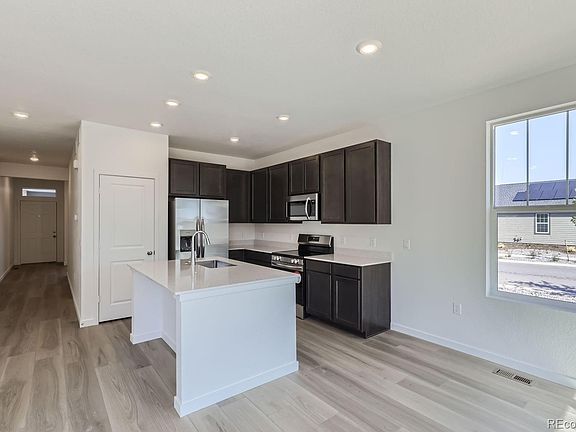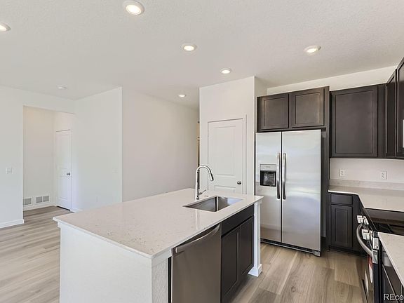 Age 55+ Gated Community at The Reserve in Green Valley Ranch. Beautiful Augusta Ranch plan by Lennar features 3 beds, 2 baths, great room, kitchen, 2 car garage and unfinished basement! Gorgeous upgrades and finishes throughout including a slab quartz counters & island, luxury vinyl plank throughout the main floor, stainless steel appliances, carpeting and more. Lennar provides the latest in energy efficiency and state of the art technology with several fabulous floorplans to choose from. Energy efficiency, and technology/connectivity seamlessly blended with luxury to make your new house a home. Green Valley Ranch offers single family homes for every lifestyle. Close to dining, shopping, entertainment and other amenities. Don't miss your opportunity. Photos are model only and subject to change. The active adult community has private roads that are privately maintained.