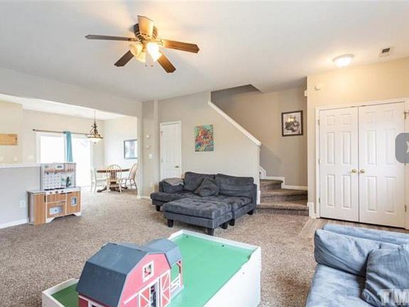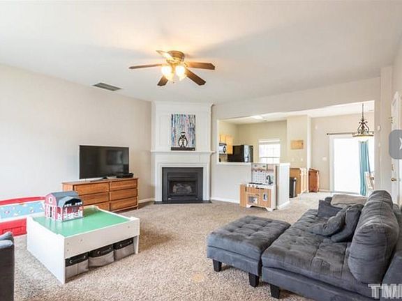 Super location near 540, Triangle Towne Center, RTP. Townhouse with separate dining room, corner gas log fireplace, stone patio, fenced yard. Well-maintained, freshly painted, and carpets cleaned. Master has wall of windows, vaulted ceiling, full bath ensuite. Private backyard with landscaped buffer. Fabulous for first-time home buyer or investors. Window treatments, all apps convey.