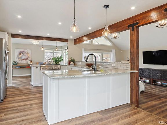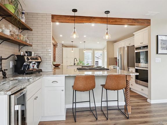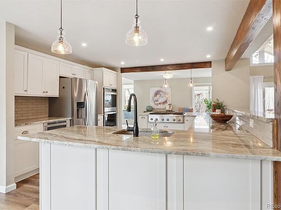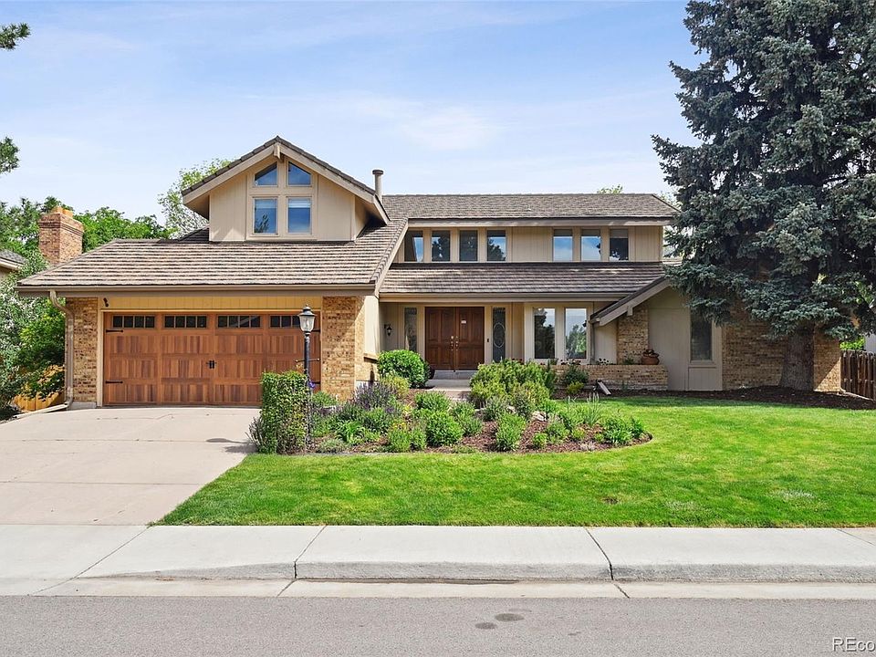 Nestled on a south-facing .22-acre lot, this stylishly updated home offers exceptional curb appeal and a modern farmhouse vibe in one of the most sought-after golf course communities! Step inside to a breathtaking two-story foyer that leads to an expansive, open-concept gourmet kitchen featuring double ovens, a gas range, stainless steel appliances, granite countertops, and a wet bar with seating and a wine cooler—perfect for entertaining. The cozy living room is anchored by a whitewashed brick gas fireplace and offers direct access to the backyard patio. A formal dining space is highlighted by dramatic two-story windows that flood the home with natural light. The main-floor primary suite is a true retreat, with a luxurious en-suite 5-piece bathroom and a walk-in closet. Upstairs, you’ll find three additional bedrooms plus dedicated office space in the loft - complete with a built-in desk and shelving. The partially finished basement provides additional living space and a huge utility/laundry room. This home has been extensively updated, including a remodeled kitchen & bathrooms, brand-new paint & carpet, new HVAC system, all new plumbing & secondary line. Additional character-rich features include millwork details, wrought iron balusters, alluring lighting fixtures, and custom tile work. The large, fenced backyard is ideal for entertaining, with a patio, brand-new sprinkler system, and outdoor lighting. The 2-car attached garage completes the package. Heritage Greens is a premier community offering tennis courts, a neighborhood pool, clubhouse, and playground, along with annual events like parades, parties, and a 5K! Located within the highly acclaimed Littleton school district, this home is also near South Suburban Rec Center, Lifetime Fitness, shopping, dining, DTC, and the High Line Canal Trail. Don’t miss this rare opportunity to own in one of the most vibrant & welcoming communities in the area!