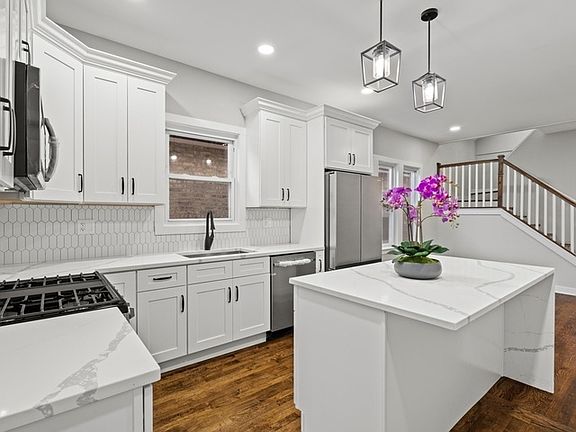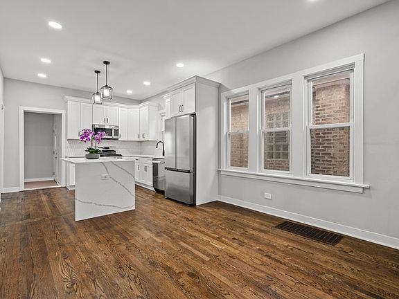 Step into this strikingly modern brick bungalow, designed for those who appreciate luxurious finishes and exceptional craftsmanship. Boasting 5 bedrooms and 3 full baths across three levels, this home offers unparalleled style and comfort. The main level is a true highlight, the living room features a stunning fireplace and newly stained hardwood floors. The chef's kitchen is a dream, with custom cabinetry, sleek quartz countertops, a quartz waterfall island, chic pendant lighting, and brand-new top-of-the-line Samsung stainless steel appliances. A stylish dining area sets the stage for family dinners and gatherings. The main floor also includes two bedrooms with ample closet space, along with an updated bath showcasing a brand-new vanity, exquisite marble finishes throughout, and a bright sunroom. On the second floor, you'll find a spacious master bedroom featuring gleaming hardwood floors, a luxurious ensuite bathroom that exudes elegance, and an additional bedroom. The finished basement offers an open floor plan that is ideal for family entertainment or as a private in-law suite. It includes a spacious bedroom with a private bathroom, laundry room, its own entrance, and plenty of room to add a kitchenette. Step outside to discover a fully fenced backyard with a manicured concrete walkway, plus a 2-car garage. Recent upgrades include brand-new appliances (2024) , washer (2024), dryer (2024), water heater (2024), fresh paint (2024), toilets (2024) replacement of several exterior door (2024), updated electrical (2024), video doorbell (2024), and recessed lighting throughout. Nestled in a prime location with easy access to schools, CTA services, expressways, restaurants, and shopping, this home is more than just a property - it's a masterpiece of modern elegance and thoughtful design. Don't miss your chance to make this remarkable home yours - schedule a tour today!