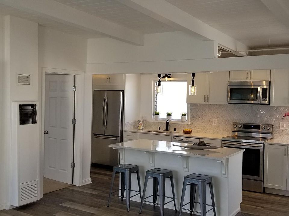 Beautiful, detached craftsman style apartment. South of PCH and a short walk to the pedestrian bridge to the beach. One block from Starbucks and restaurants. Newly remodeled with all new stainless appliances and new bath and kitchen fixtures, custom quartz countertops and backsplash, new custom cabinets with self-closing doors and drawers, new vinyl hardwood flooring and carpet, all new paint, etc. Air conditioning in master bedroom, ceiling fan in secondary bedroom. Plenty of natural light and new window blinds throughout. Direct access to shared laundry. Brick patio at entry area. Large custom closets in both bedrooms. On-street parking, but storage available in the garage for surfboards, bikes, etc. Year lease; non-smoking, pets considered, shown by appointment only. Landlord pays water, sewer and trash; tenant pays all other utilities.