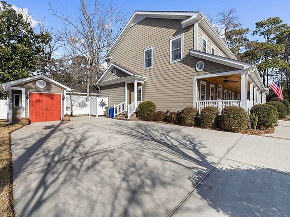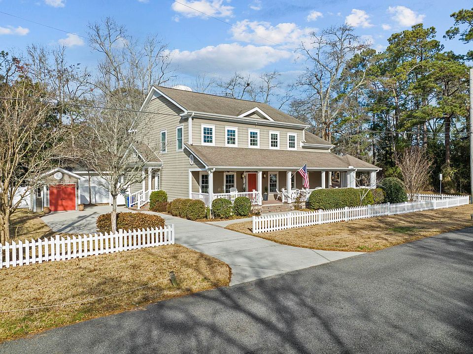 Relax in this Well-Appointed Low Country style, custom home with large wrap-around porch (Trex type decking & ceiling fans), situated on the corner of Hickory & 10th Ave S in the Town of Surfside Beach! Only 4 blocks to the Beach! Boasting 5 large Bedrooms, 3.5 Baths plus outdoor shower, professionally installed gas generator and tankless gas hot water heater! TWO large Primary bedrooms (1 Down & 1 Up) both with 'ensuite bathrooms. 3 additional guest bedrooms (5th bedroom currently used as a study/den). Gourmet Kitchen with island, large pantry, butler's pantry, coffee bar area, granite countertops, custom cabinetry, stainless steel appliances, (including Gas range, wall oven, wall microwave, separate warming drawer, dishwasher and refrigerator), and recessed lighting. Large living room with electric fireplace! Large dining area! Large laundry room with additional cabinetry affording more storage space. Laundry room also has a sink & counter space for folding. Easy access from laundry to the front porch and built-in Gas Grill/Prepping station! Home also offers several extra storage closets and linen closets throughout the home both upstairs and down as well as a large attic area with pull downstairs. Additionally, home has an outdoor golf cart garage/ workshop with electric! **More interior info: 9 foot flat ceilings and crown molding throughout home! Central Vacuum system. Bedrooms 3 & 4 share a tub/shower combo but have their own vanity and toilet areas. Bedroom 5 is currently used as a study off of bedroom 4. Beautiful 2nd story landing area makes for a cozy study or sitting area. Primary bedroom downstairs has electric fireplace, 3 walk-in closets, double sink vanity, separate tub and walk-in shower. Yard is sodded and has fencing. Easy walk to the beach- sidewalks. No HOA. Do it... Make this one Yours!