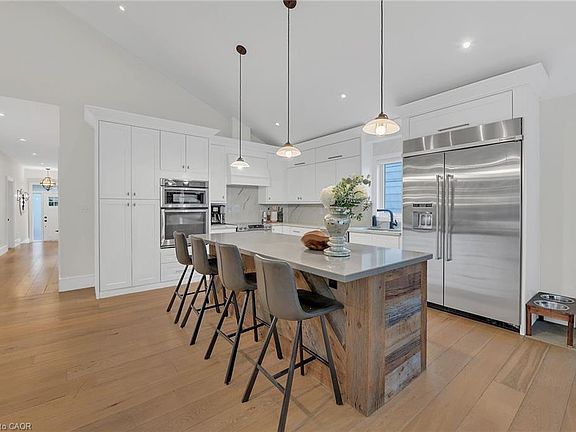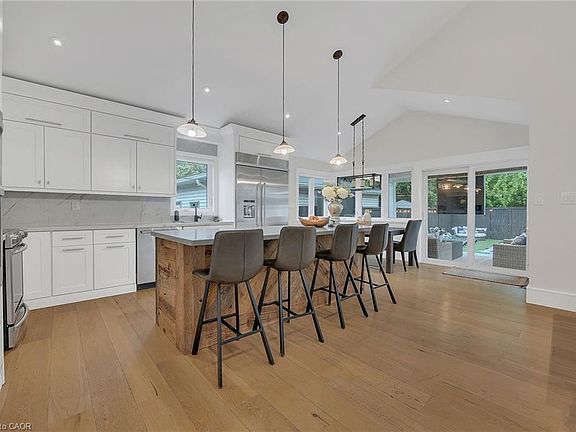 Rare 1800 sq foot bungalow w/ 9' ceilings in popular downtown Burlington complete w/ a salt water pool & detached garage! As soon as you enter you will be in awe of the abundance of natural light. The flooring is consistent engineered hardwood on both the main floor & LL The main floor has 3 perfect size beds - primary has ensuite w/ 2 sinks & heated floors, 2 additional bedshare a jack & jill w/ separated sinks from toilet/tub. Heading towards the back of the home you will be impressed w/ the huge open concept living room & kitchen space with a perfect vaulted ceiling - giving the perfect amount of height, space & light. The kitchen has tons of storage, an oversized island & appliances meant for family and entertaining including a built in microwave/oven, separate oven & oversized fridge. Patio doors off kitchen lead to one of the best rooms of the house -the outdoor covered patio! The perfect spot to watch tv or BBQ while kids swim in the inground saltwater pool w/ waterfall & gas heater! You will love the low maint yard w/ irrigation in the front & turf in the backyard. The custom detached garage is insulated and heated (gas) & ready for any of your needs! Includes lots of storage & roll up windows for "bar" access when the need arises. No rear neighbours is another rare feature in this gem of a home. Back inside as you head to the lower level down the custom staircase, you'll find a handy side entrance/mud room area with laundry & a powder room. Once you arrive at the lower level, you will again be amazed by the abundance of natural light from oversized windows. The LL space itself is also a rare find in a downtown bungalow with the great room running over 30' wide! The great room has a stunning custom fireplace set up with custom cabinetry surrounding it and off to the back is a custom wet bar with a fridge, dishwasher, & sink. Additionally there is a big office and huge bedroom w/ ensuite & cold storage. Rare opportunity that won't last!