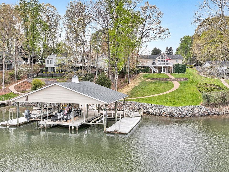 Cedar Ridge-This adorable lakefront property consist of .73 acres with 100 ft of wf and captivating long channel views. The dock is enormous with triple slips, storage and lots of space for family and friends. Deep water off the dock and gentle slope from home with lots of outdoor living space. You will enter into this beautiful fully furnished home with stack stone fireplace in Great room with elevated ceilings. Kitchen includes Granite, stainless steel appliances including Refrigerator with Water Dispenser, Toaster Oven, MW, Range and Dishwasher. 6 brs and 3 full baths. Windows are Dbl pane, New Glass in Living area. Lower level includes laminate floors with Granite on Bar and includes Refrigerator. 200 amp service (3br pumpback system for Septic) Hotwater heater 2004. HVAC 2021.