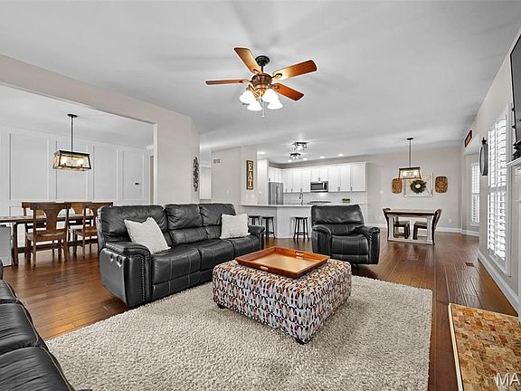 This IMMACULATE ranch w/tall 9' ceilings & rich hardwood floors on the main level is filled with luxurious finishes you will love. Updated kitchen has quartz counters, 42" soft-close cabinets w/roll-out trays, stainless steel appliances, breakfast bar & breakfast room w/bay sliding door that opens to a composite deck. Gather in the great room w/fireplace flanked by plantation shutter-covered windows & a shiplap wall. Dining room has beautiful board & batten wall accents. Tucked in the back is a private primary suite w/walk-in closet & lovely ensuite bath. Entertain in the spacious lower level rec room w/wet bar that opens to the covered patio in the irrigated yard w/invisible pet fence. Lower level also has a home office & private bedroom & full bath teens/guests will appreciate. 3-car garage. Neighborhood pool & playground down the street. All 3 Wentzville (Liberty) Schools are nearby, as well as great shopping, dining & weekend farmer's market. Easy access to I-64/364. See it today!