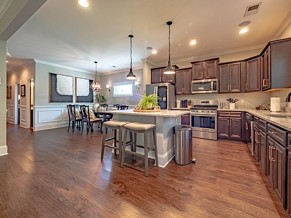 This 5-bedroom, 3-bath home features one of Great Southern Homes most popular floorplans, the Bentcreek H. The main level includes a versatile bedroom/office and a full bath, perfect for guests or a work-from-home setup. The open-concept kitchen boasts a beautiful design with a huge island overlooking the spacious family room — ideal for entertaining. Upstairs, you'll find a separate living area, a LARGE master suite with a private bath, and dual his-and-hers closets. Three additional generously sized bedrooms provide plenty of space for family and guests. The home backs up to 44 acres of green space, offering both privacy and a peaceful view.