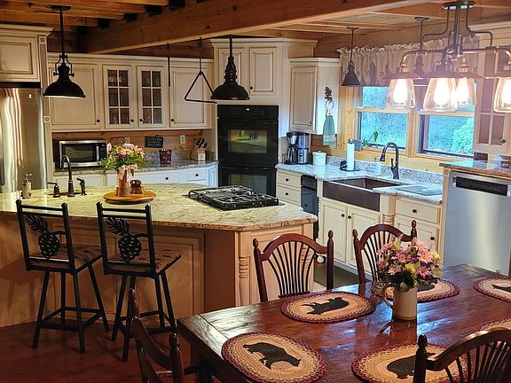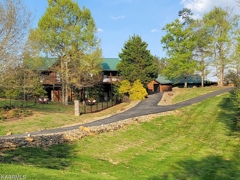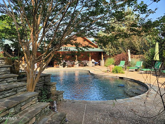 Enjoy the solitude and park-like setting of this beautiful 3BR, 3BA luxury full-log home on 2.44 landscaped and wooded acres located in a quiet country neighborhood. The main floor of the home boasts a high-end kitchen; luxurious living area with cathedral ceiling, gas fireplace, and patio doors leading to the deck; two bedrooms (master bedroom/bath); den/office; and loft. The fully finished walkout basement features a spacious great room, bedroom, office, bath, rec room with pool table, large laundry room, plenty of storage, and doors leading to patio and hot tub. Several bonus room allow plenty of space of extra guests. A large deck runs along the front of the house, and a screened deck runs the length of the back of the house. Looking for a place for large family or group gatherings? This property features an additional building housing a 25x30 heated & cooled party room with appliances and wood burning fireplace, full bath, pool changing room (yes, there is a gorgeous heated salt-water pool with slide and waterfall!), and 2-car garage. The acreage has mature trees as well as ornamentals and perennials. All this and a mountain view! Relax, entertain, get away from it all! This property truly does check all the boxes! (Most furniture and some furnishings available, not included in list price.) As with all Real Estate transactions, Buyer(s) should verify all information independently including HOA info and Square Footage, Buy title insurance, have a survey, home inspection, and all other needed inspections. Equal housing opportunity. Most information from Tax records and not verified by listing agent/Company. Sq footage is approximate and includes party room and pool changing area/bath.