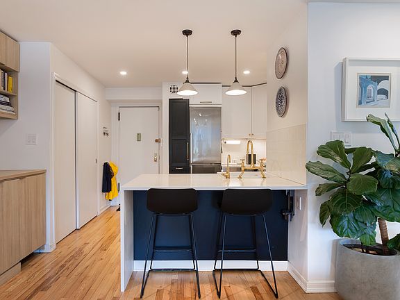 July 1st Occupancy- 2 Bedroom Rental. This well appointed, modern 2 bedroom is the result of a complete renovation throughout. Unit 4H is a corner unit located on the 4th floor with unobstructed, bright & sunny southern and western views. The entry has a large closet that can hold much more than just coats. The modern kitchen features quartz counters, shaker cabinets and stainless steel appliances including a dishwasher and microwave. Separated by a large island counter and 2 stools, it overlooks the large living/dining area that is filled with natural light from a wall of windows. The living space features a large built-in for books, storage, additional counter space and yes, a wine fridge. Separated by the windowed modern bathroom, the bedrooms each have good closets and southern exposure. The master is huge and can accommodate a king size bed and much more. This unit has hardwood floors, great storage and thru-wall AC units in each room. Heat, hot water and cooking gas are included in the rent. This rental is in a coop and does require board approval, while there is no broker's fee, there is a $300. non refundable application fee. The Manchester is a postwar building and one of Kensington's most desirable coops, it features 2 updated elevators, newer windows, boiler & roof, indoor parking garage (wailtisted), central laundry, additional storage & bike room and a large outdoor green space. There is a live in super & full-time porter. Located Just Off Cortelyou Rd, it is just 3 blocks from the Ditmas Park Strip of great restaurants, bars, cafes and a weekend farmer's market. Public transportation options offer the Q, B, F & G trains & the express buses, BM1, 2, 3 & 4 (which go directly to downtown and midtown Manhattan. You can get to Battery Park within one 20 min stop) Prospect Park is just blocks away. The Manchester is Cat Friendly Sorry No Dogs