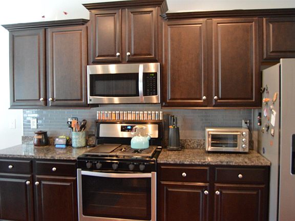 • RoomKitchenFeatures: Granite Counters, Eat-in Kitchen, Cabinets-Stained, Bar, Backsplash-Tiled
