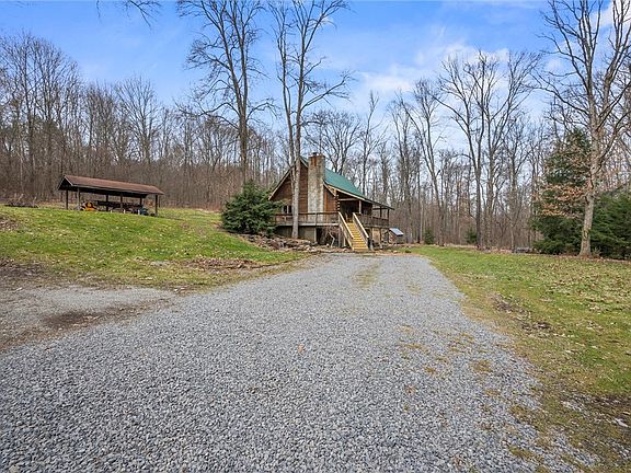 Escape to rustic charm with this stunning 3-bedroom, 2-bath log home on 8.91 scenic acres. A tranquil stream meanders through the mostly wooded lot, offering a peaceful retreat. Inside, enjoy oak wood floors milled from trees on the property and a warm, open concept living, dining and kitchen area. Center stage is the spacious Living Room with wood burning custom stone fireplace! Additional heat or wood could be the main source! The kitchen features unique colored cement counters and a repurposed, stained and polished wood bar top. The main-floor primary bedroom and full bath provide convenience, while the upper-level loft offers a cozy family or office space, two bedrooms, and a full bath. Relax on the 3/4 wraparound porch and take in breathtaking views. Built with durable yellow pine, this home blends rustic charm with lasting quality. The stream, endless maple trees to tap, plus privacy! Full basement storage completes the package..Don’t miss this one-of-a-kind log home!
