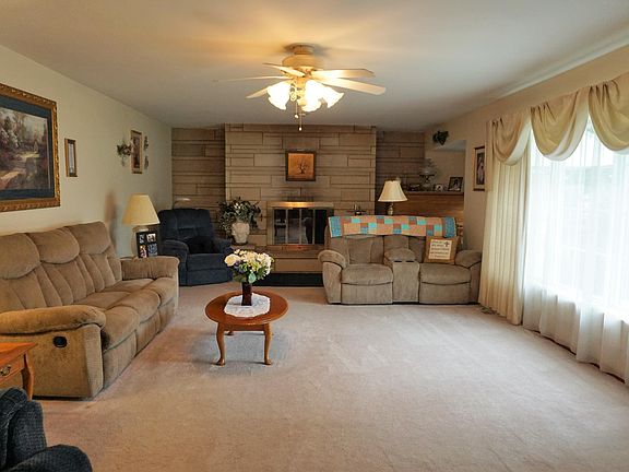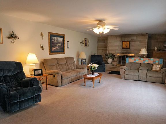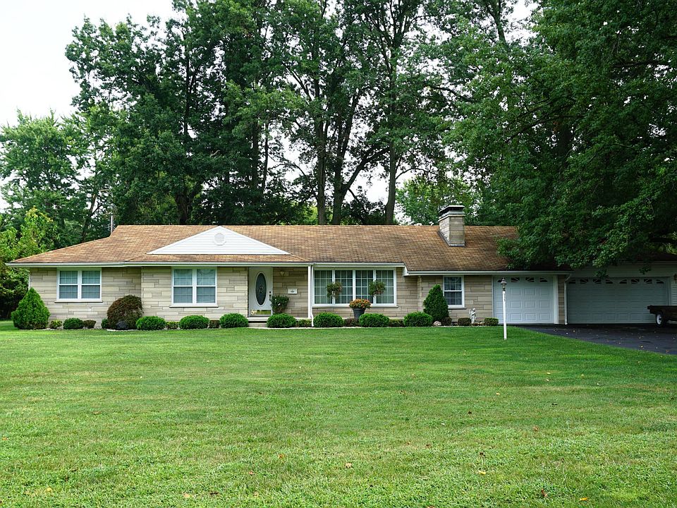 One of a kind home on a beautiful lot with mature trees - almost 2 full acres in town! Well-maintained and welcoming home offering huge living room and stone fireplace. Formal dining room along with kitchenette area. Kitchen has an island cooktop and a wall of cabinetry with counter space. 3 car attached garage along with a 1 car garage behind home for extra storage of the mowing equipment. 27x13 screened patio for year round relaxing. Furnace updated 3 years ago. The stone exterior sets this home apart from others. Great country feeling with the trees and acreage but the conveniences found from living in town. Current owner enjoyed the home for 19 years. Don't delay, call and be the next to enjoy this one of kind setting in town!