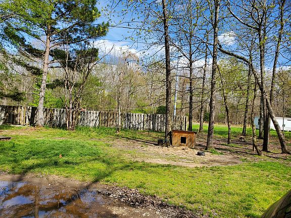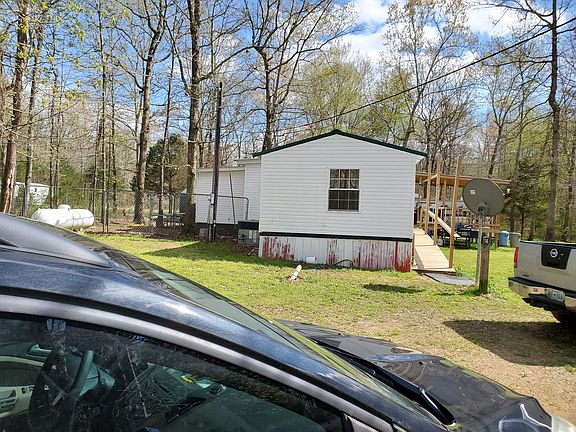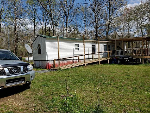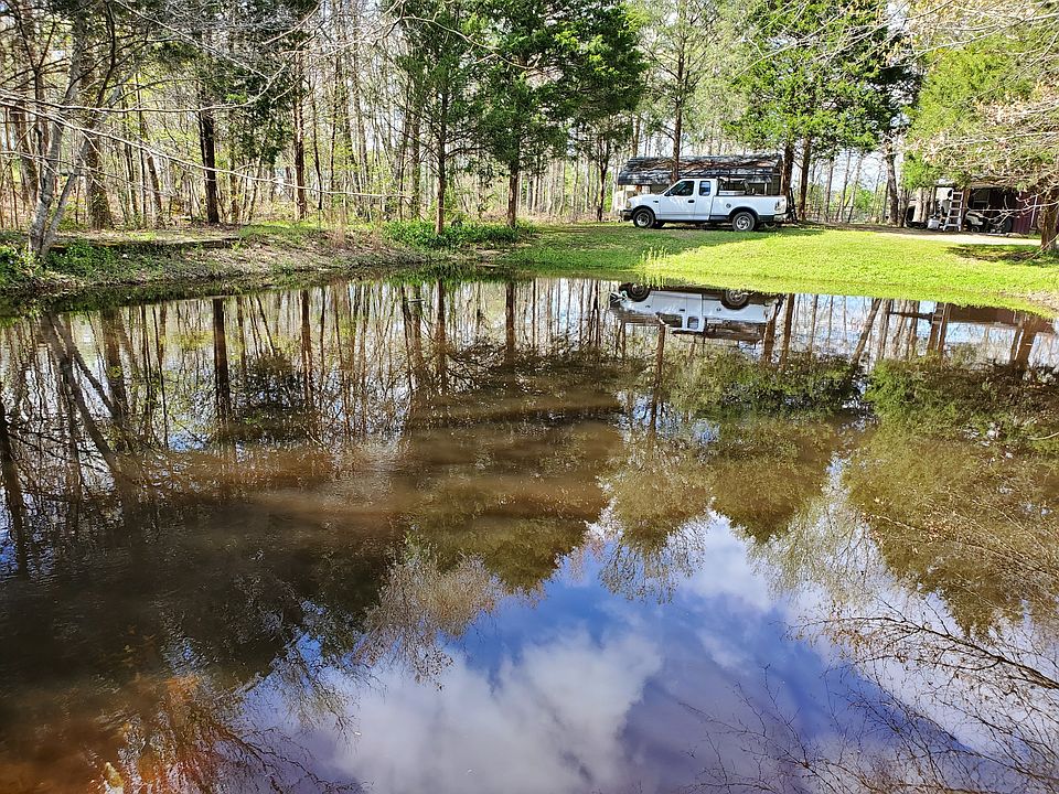 Single wide mobile home with master bedroom and bath added on the back. A large covered front porch added on the front. A pond with a creek flowing into and out of it. Mostly wooded acreage, with fencing in front for horses or other livestock.