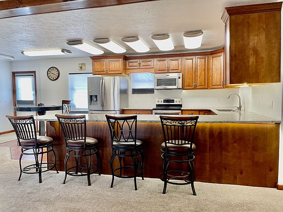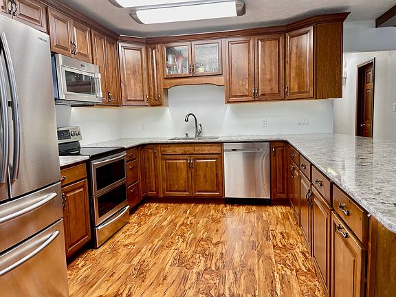 The wait is over if you are looking for a one level home that has been recently updated and move-in ready with detached garage and heated shop! Features almost 1,500 sqft with desirable open concept floor plan, 4 bedrooms and 2 bathrooms. The living area at the front entry is characterized by façade beams matching the custom kitchen cabinetry, flooring, and woodwork.The tastefully designed u-shaped kitchen includes a breakfast bar, stainless appliances, and quartz counter tops. There is a separate dining area for additional entertaining space or seating near the back entrance. The private master bedroom with en suite bath has custom cabinetry, a double vanity, and an Onyx walk in shower.There is abundant light with new fixtures and windows with custom blinds.Three bedrooms are at the other end of the home along with a full bathroom that includes the washer/dryer.The HVAC, roof, and windows have been previously upgraded. There is a 21'x28' detached garage as well as a NEW 24'x30' insulated shop. This property is truly one-of-a-kind located near the hospital, park, pool, and schools.