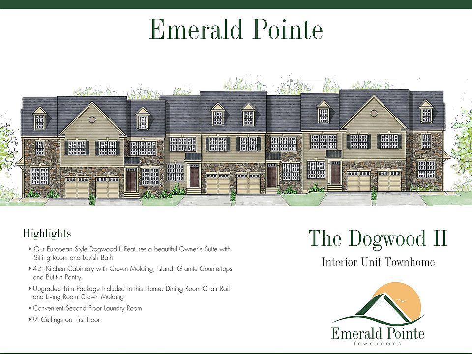 Our European style Dogwood II model located in the new Emerald Pointe, features a beautiful owners suite with sitting room and lavish bath. The kitchen is complete with 42" cabinetry with crown molding granite island and granite counter tops, and built in pantry standard. This unit is complete with an upgraded trim package including a dining room chair rail and crown molding in the living room standard. Additionally hard wood flooring is standard on the first floor of the home.The second floor features a laundry room and the first floor features 9 foot ceilings.