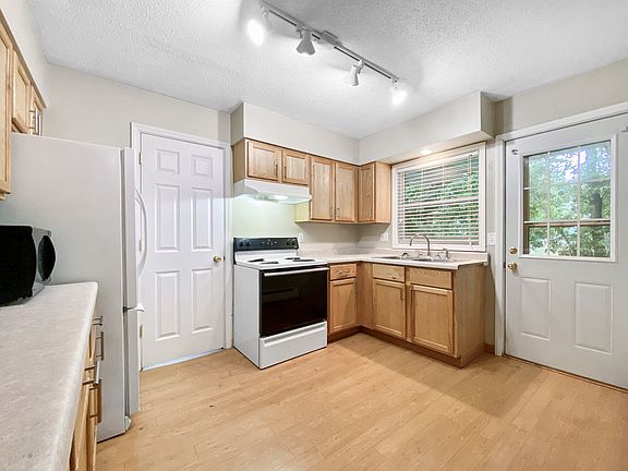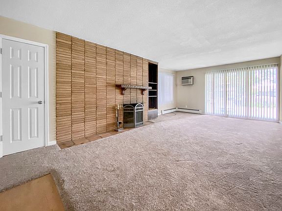 Spacious three-bedroom apartment featuring a large living room with plush neutral carpeting, a distinctive wood accent wall, and a wood-burning fireplace with mantle and metal screen for cozy evenings. Wide sliding glass door with vertical blinds brings in abundant natural light and opens to a patio or balcony, complemented by a built-in wall air conditioner and baseboard heating for year-round comfort. Bright kitchen includes natural wood cabinetry, laminate countertops, white electric range with hood, refrigerator, stainless-steel double sink under a window with blinds, and easy-care laminate flooring with overhead track lighting and an exterior door for convenient access. Each bedroom offers plush carpeting, generous closet space including mirrored sliding doors in one room and large windows with blinds to maximize natural light. Full bathroom features a tub-shower combo with white tile surround, single-sink vanity with integrated counter and storage, wide mirror with vanity lighting, and neutral tile flooring. Ideal layout for functionality and comfort in a central location. Tenants responsible for all utilities, lawn care, and snow removal.