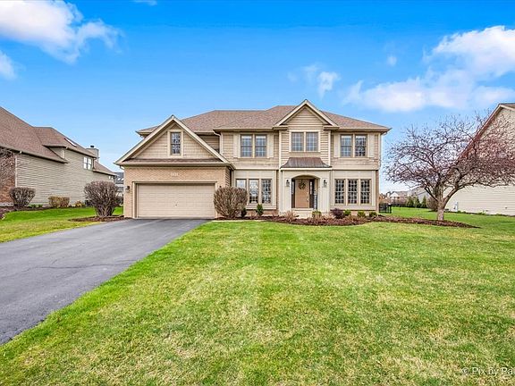 Better than new construction and move-in ready! This beautiful 4000 sq. ft home in Moose Lake Estates has been freshly painted in most areas and is the one you've been waiting for. Fantastic open floor plan features a 2-story foyer, formal living and dining rooms, and solid, real hardwood floors throughout most of the 1st floor. There is a private den with glass french doors and a 1st floor laundry room. Step back into the over-sized kitchen that has everything you can envision. Loads of countertop space with granite tops, an island, all SS appliances that stay and a large eat-in area. The adjoining family room features a custom tray ceiling with accent lights, a brick fireplace with gas logs and plenty of natural lighting beaming in from lots of beautiful windows. Step outdoors thru French doors to discover the perfect place for summer entertaining. The deck is new (2023) with an adjacent brick paver patio and knee walls. The yard is fully fenced in and boasts gorgeous landscaping with loads of perennials. Upstairs features 4 bedrooms including a princess suite with a full bath, and a large loft with custom windows. The master bedroom is huge with a tray ceiling and a luxury bath with all of the upgrades, dual sinks, separate shower, soaker tub and a large walk-in closet. The basement is a deep-pour and has the rough-in for a future bathroom. A 3-car garage completes the picture with views of the park & pond across the street. This home is not only beautiful but has been wonderfully maintained, newer roof and gutters in 2018, newer H2O heater in 2018, and a NEW dual high-efficiency furnace and CA in 2023. This home has so much to offer and is conveniently located within minutes from I-88, the Fox River with miles of walking/biking trails and great shopping.