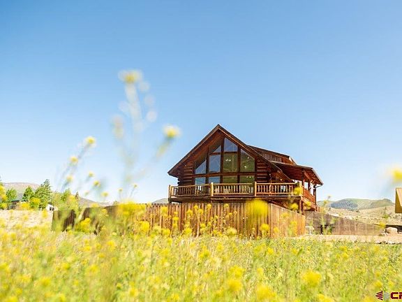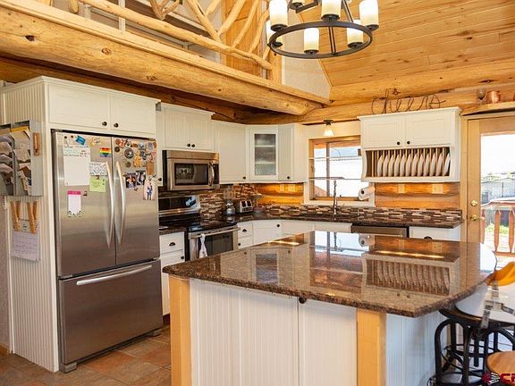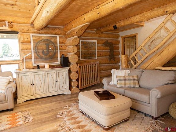 Round log home with 4 bedrooms and 3 baths is a must-see. Located just south and west of the quaint town of Creede, Colorado you find this log home. 2,187 square feet of living space. The entire main floor carpet was removed in 2021 and replaced with extra wide vinyl plank flooring which looks gorgeous and is easy to keep clean. The master ensuite is on the main floor with walk-in closet. Open concept living/dining kitchen is also on the main level with a cathedral ceiling and massive log beams and decorative woodwork. The south side of the living space has floor to ceiling windows allowing for passive solar warmth. The beautiful kitchen was remodeled in 2015 with; eat in island with granite countertops and convenient large soft close storage drawers, custom kitchen cabinets and new refrigerator and kitchen range. In 2021 the kitchen was again updated with a fresh coat of paint to brighten up the room. Spacious mud/laundry room rounds out the main floor. The upstairs loft has a TV room and two bedrooms and a full bath which was also remodeled in 2015 with rustic cherry cabinetry and granite countertop. Walk out basement houses the 4th bedroom and large bonus room currently used as an office as well as attached single car garage. The one acre lot has a nice grassy fenced front yard with a chicken coup and fence backyard for pets. The deck wraps around two sides of the house. Rounding out this property is a large detached garage/shop. The shop is fully insulated and separate two-car garage, 576 square feet, and an insulated shop of 768 square feet.