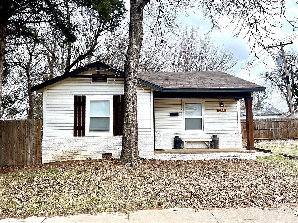 Welcome to this charming and completely remodeled farmhouse-styled home, perfect for those seeking comfort and style. Boasting 2 cozy bedrooms and a gorgeous bathroom, this gem spans 812 square feet of beautifully updated space. As you step inside, you're greeted by an inviting living room, perfect for relaxing and entertaining. The spacious kitchen features quartz countertops and classic subway tile. The bathroom features granite countertops, a rustic shower and a gorgeous wooded ceiling for a touch of charm. Shiplap walls throughout add character and warmth. Extra storage in the hallway ensures you'll have plenty of room for essentials. This home even includes the appliances—stove, dishwasher, refrigerator, and stackable washer and dryer. Step outside on the covered back patio to enjoy a cute, fenced yard offering privacy and potential for cozy outdoor gatherings. For those who are a bit handy, there is a unique bonus to this property. There is an unfinished outbuilding in the backyard that has the versatility of becoming a storage area, office, or even a small efficiency. It is currently set up with bathroom and kitchenette space that can be remodeled to your liking. Don't miss the chance to make this adorable, updated home yours. Schedule a viewing today!