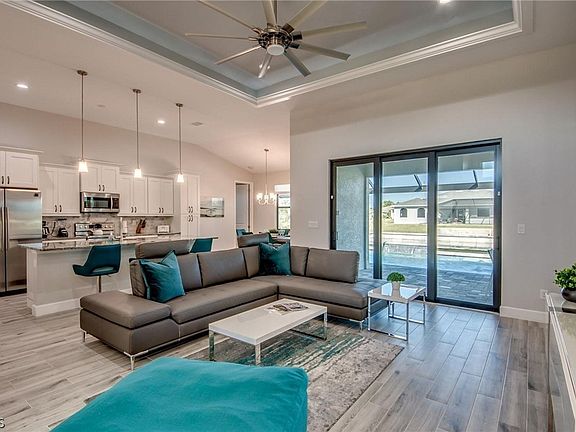 Stunning Waterfront Home in SW Cape Coral situated on oversized lot with 110FT of seawall. This gorgeous home was built in 2019, offers 4 bedrooms, 2 bathrooms and an open living concept. A lot of attention to detail went into the construction of this property! The impact sliding glass doors open to a large paved pool deck with heated pool and a covered lanai w/ picture screen pool enclosure .The interior of the home features a spacious living area with an elegant white kitchen w/ upgraded countertops, wine cooler and a breakfast bar. More upgrades include coffered ceilings with ambience lighting, porcelain tile in the main living area , walk-in shower and his and hers sinks in master bathroom, impact doors and windows and a 3 car garage. Enjoy beautiful views of the Freshwater canal. Assessments PAID! This home comes fully furnished and decorated.