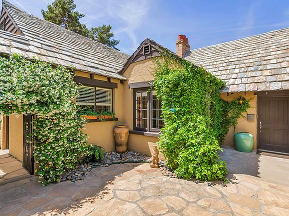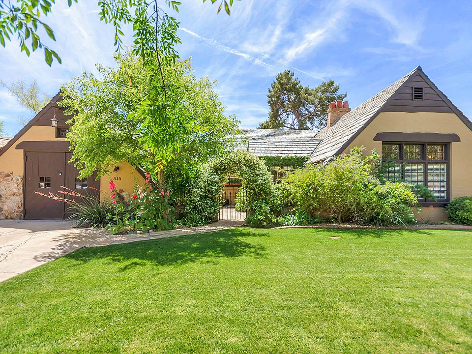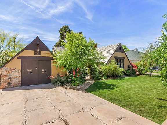 This extremely rare recently refreshed 1935 English Cotswold Tudor was featured on the 2014 Willo Home Tour. The home was also published in the AZ Republic. Historic details abound. Home features a distinctive slate roof, scored concrete floors, a corner fireplace in the living room, beamed ceilings, original hardwood floors, sash windows, coved ceilings, French doors & vaulted ceilings in the living room. This split floor plan home has 3 bedrooms & 2 renovated baths. A beautiful courtyard & amazing curb appeal welcome you to the home. Lush landscaping & private gardens are found throughout the property. Kitchen amenities include granite countertops, updated cabinetry & stainless steel appliances. Sq footage includes the detached guest studio & the new media room in the finished basementThe home has been freshly painted inside and out. Private yard with block wall. Oversized lot. 1 car garage. This home is a must see. One of the most unique homes in Willo. Guest house is a large studio room. Solar panel is for the hot water heater.