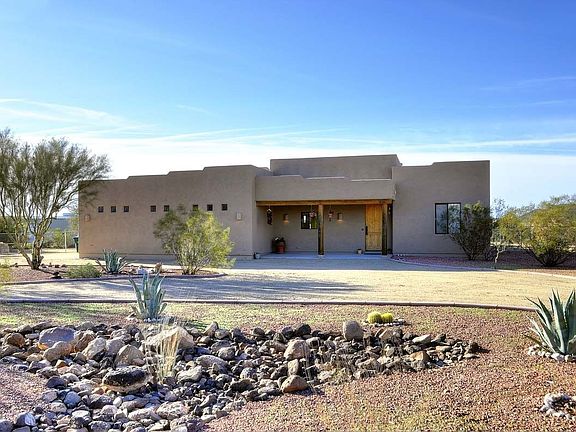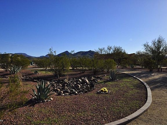 Beautiful custom territorial home on 1+ acres with mountain views.Spacious open floor plan with gas burning fireplace and entertainment center wall,stainless steel kitchen appliances,breakfast bar,split flood plan,circular driveway, rv gate, and room for a horse.Back facing south patio is secluded for privacy with water fountain but the rest of yard has multiple citrus trees. Separate garden preparation area. Third car garage is over sized with workbench,heated/cooled,and has separate bath.It can be a workshop, garage,or converted into a private suite.This area is not included in the sq ft.,but it is about 450 sq ft. Other garage is extended.New well system put in last year.Propane on property holds 124 gallons and stays with property.Outside of home just painted,roof recoated,3 new AC
