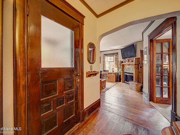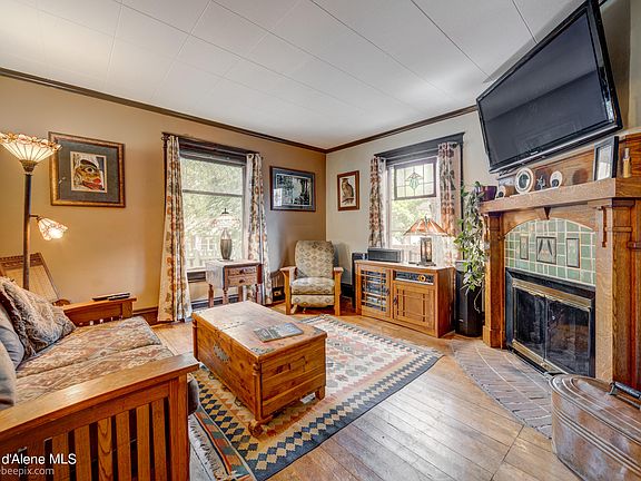 This residence seamlessly blends historic charm with modern upgrades, including a 2013 addition featuring elegant solid oak custom woodworking throughout. This charming 4-bed, 2-bath home is in the the heart of Coeur d'Alene! Situated on 0.26 acres (1.5 city lots), this 2,651 sf home offers a main floor with 2 cozy living rooms and fireplace, office (or 4th bedroom), kitchen, bath, laundry, and a great room w/fireplace, and a dining area leading to the backyard. Upstairs, you will find 3-bed, including one with a balcony, plus a full bath w/tub & a library with built-in bookshelves. The basement provides ample storage and flexible space. Outdoors, enjoy a large deck, detached 2-car garage, two sheds, a pond, and alley access with the potential for a large garage with an ADU, zoned R-12. No CC&Rs! Conveniently located near bike trails, city park, Lake Coeur d'Alene, restaurants, shopping, and Tubbs Hill.