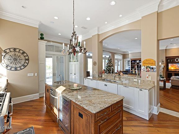 Mesmerizing CANAL FRONT home featuring a Heated Infinity Pool w/Hot Tub, Whole Home Generator, Boat Dock/Lift with 2 Jet Ski Lifts, Seawall, Outdoor Kitchen, and Minutes to the Beautiful Gulf-of-Mexico. From the time you enter the grand foyer you can feel the space this open concept home has. The living room is straight ahead featuring river bottom pinewood floors that are outlined with travertine, gorgeous stone gas fireplace, and triple French doors overlooking the pool and canal. To the immediate right is a bonus room, which could be used as a 4th master suite with beautiful custom windows allowing for natural lighting and features a wet bar with an ice maker. The dining room is to the immediate left with custom arches and a stunning chandelier with matching scones. Where do I start with the gourmet kitchen... This is a chefs dream with granite countertops, upgraded appliances to include a six burner Dacor gas stovetop and oven with a separate steamer, warming drawer, built-in refrigerator to match cabinetry, separate convection oven, wine refrigerator, kitchen island with a vegetable sink, all with a travertine backsplash. The amount of cabinetry in this kitchen is amazing with more than enough space for those holiday dishes! The master bedroom overlooks the canal with stunning morning views and the master bath is a dream. Featuring an oversized travertine shower with steamer, double vanity sinks with granite countertops, extensive cabinetry, makeup desk, jacuzzi tub, with a split entry closet with built-ins, cabinetry, and even a built in safe. The laundry is on the 1st floor and includes plenty of working space to include granite countertops, sink, extensive cabinetry, and the washer and dryer remain with the home. The second floor features a large open bonus room, currently set up as a gym, but could be used as a 2nd living room, office, playroom, or anything your heart desires. The custom windows allow for beautiful natural light and there is even a wet bar with a sink and refrigerator for entertaining. There is a large walk-in storage off the bonus room that is 14.6x5.11, that also includes pull down attic storage. The other two bedrooms face the canal/pool, and both feature French doors leading out to the 28.8x7.7 covered balcony with a beautiful view of the outside entertaining area. There is also a full bath on the second floor with granite countertops and double vanity sinks. This home has so much to offer and attention to detail and elegance defines this home. The custom brick paver circular driveway compliments the stunning grand entrance and lush landscaping surrounds the home. The back of the home is where you will spend most of your time. The backyard is an entertainers dream featuring a 43.10x10 covered porch with an outdoor kitchen, gas grill, sink, and refrigerator, outdoor shower, outdoor bathroom, beautiful infinity pool with edge overflow, hot tub, 10,000lb boatlift with water/electricity, and two jet ski lifts. There is too much to mention on this home with the limited characters we have, so please ask your realtor to print out the key feature sheet from the MLS. Additional Features and upgrades include: New roof, gutters, soffits-2020, 3 AC units with one new in 2022, Pool heater replaced 2020, Polaris and pool pump replaced 2020, new interior and exterior paint, Pool decking/seawall was structurally reinforced in 2020, garage floor recently painted, alarm system, lawn irrigation with a separate meter, upgraded lighting, Navien tankless water heater 2019, 12-ft ceilings on the first floor with 13 inch crown molding, surround sound on the 1st floor, and other than the 2 bedrooms upstairs which are carpet, the home is all river bottom pinewood or travertine flooring. If you are not familiar with Bay Point, it is our premier gated community with 24-hour security. This private waterfront community features a newly built full-serv boats as large as 130 feet, Jack Nicklaus golf course, tennis, spa, restaurants, and even their own post office. If this sounds like the home you have been looking for, contact your realtor for a private showing before your dream of owning a piece of luxury becomes someone else's reality. Age, Sq.Ft., Room dimensions, schools, taxes, are all estimates. It is the buyer's responsibility to verify by a personal or professional inspection if important.