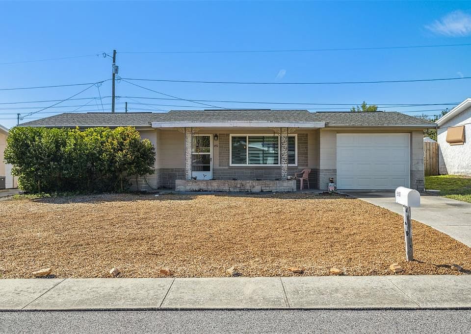 Welcome to your dream home! This charming single-family residence offers a cozy yet spacious retreat for you and your loved ones. As you approach the home, you’re greeted by the inviting curb appeal featuring a low-maintenance exterior enhanced with pebbles, ensuring your front yard remains maintained with minimal effort. The covered front porch provides a perfect spot to sit and unwind with a cup of coffee to enjoy the beautiful flower bed. Upon entering, you'll immediately appreciate the open layout, which allows a generous amount of natural light to fill the space through numerous windows. Throughout most of the home, you will find tasteful tile flooring, offering both durability and aesthetic appeal, while the bedrooms convey warmth with their gorgeous vinyl wood floors. Equipped with two bedrooms and one and a half bathrooms, this residence offers ample space for relaxation and rejuvenation. Both bedrooms are nicely sized, while the open living area seamlessly flows into the dining and kitchen space, ideal for entertaining guests or enjoying family meals together. The galley kitchen offers a breakfast bar, plentiful countertop space and cabinetry. For those who appreciate natural light and the beauty of the outdoors, a Florida room awaits, offering a quiet retreat immersed in sunlight, perfect for reading, meditation, or simply enjoying a view of the backyard. This home is not only beautiful but also practical, with a host of recent upgrades including a new HVAC system (2022) ensuring year-round comfort, new hurricane impact windows (2022) providing peace of mind during storm season, and new window shades (2021) offering privacy and style. The freshly painted ceilings (2022) add a clean, crisp finish to every room, enhancing the overall feeling in the home. Adding the final touch is a brand-new garage door, ensuring convenience and security for your vehicle and belongings. There is no HOA and no CDD. Close to main highway and shopping areas. Don't miss your chance to make this property your own.
