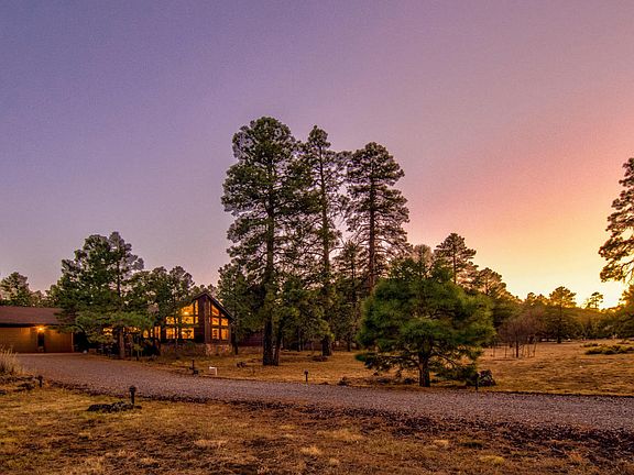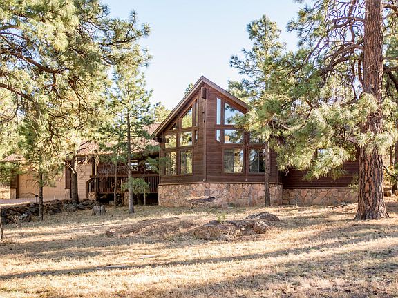 Looking for a private home in the forest? This beautiful mountain home at the end of a cul-de-sac is nestled amongst ponderosa pines on 2.5 acres backing forest. Just outside your back gate is Picture Canyon and the AZ Trail in the desirable community of Oakwood Pines with paved road access! The backyard is full of mature ponderosa pine and oak trees with rock outcroppings that create privacy so you'll enjoy your time relaxing outdoors on the patio or hiking outside your backyard that has direct access to 400 acres of forest. This spectacular property has view fencing, allows horses, and has a 400 S.F. shed, RV Gate, and expanded 3 car garage. Inside there is an open floor plan with a wall of windows that soar to the vaulted tongue and groove ceiling and let in lots of light.