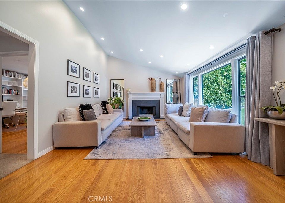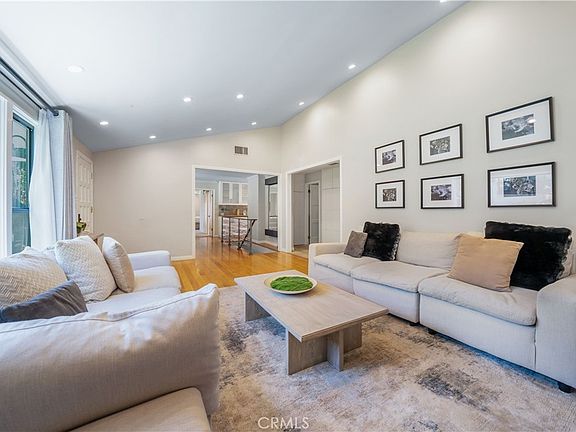 Charming gated two-story, 4-bedroom, 3-bath home offers nearly 2,800 sq ft of living space on a 9,618 sq ft lot South of the Boulevard. A private entry leads to ample driveway parking, a covered two-car carport, a welcoming veranda, and landscaped turf grounds. Inside, soaring ceilings, custom millwork, and walls of glass fill the home with natural light. The updated chef's kitchen with stainless appliances flows to multiple indoor-outdoor entertaining areas, including an expansive terrace with tree lined views. The main level features vaulted ceilings, airy living and dining rooms, a bonus family room with exposed wood beams and fireplace, a bedroom with custom built-ins, a vintage clawfoot bath, and a serene primary suite with spa bath, walk-in closet, and French doors to a private balcony. The remodeled lower level adds two bedrooms, a full bath, a flexible space with built-ins, plus a laundry room and another separate bonus room ideal for an office, gym, or studio. The gated backyard offers generous entertaining space, secure play areas, and citrus trees for fresh fruit. 5150 Elvira combines rare privacy with easy access to Ventura Boulevard, top schools, shopping, dining, the freeway, and the beach.