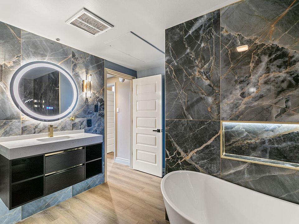 Modern upgradesIndirect lightingStainless-steel appliancesWaterfall countertopsModern soaking tubSmart refrigeratorSleek open kitchen