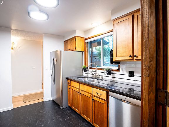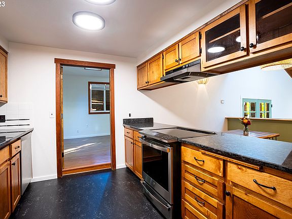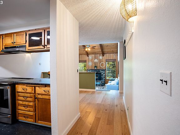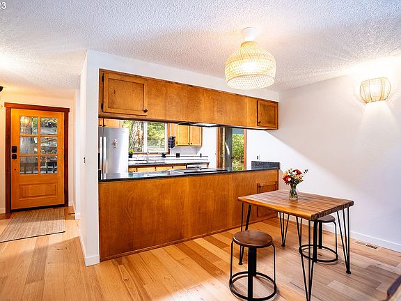 Beautifully updated northwest contemporary home nested in the forest of South Eugene. This home features all new wood flooring, new paint, new light fixtures, new kitchen appliances, and a luxuriously remodeled primary bedroom. Enjoy vaulted ceilings, large windows, natural light, fenced in area, covered deck and lovely forest views. Bonus room off the kitchen could be a 3rd bedroom or den. This home is on a quiet street in a desirable South Eugene location. Just a short walk to Amazon Trail, Martin Street trail and Frank Kinney park.