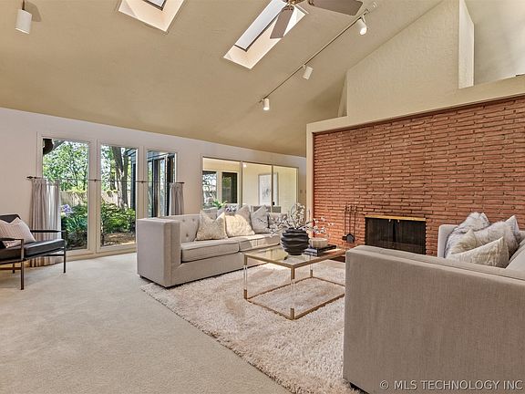 Spectacular Mid Century Modern Ranch on .5 acre lot. Quiet horse shoe street easy access to all Tulsa has to offer. New roof (9/23) and HVAC 4/23) 3 Living space, Open dining and Kitchen. Double fireplace. 10 ft + ceiling with transom windows and special lighting. Den, Florida room and Covered Porch and Patio. Amazing windows and views of landscaped half acre lot. 3 bedroom and 2 bath with full MIL suit - which has a huge bedroom, living space, storage closet and bathroom. Oversized 2 car garage. Sprinkler system.