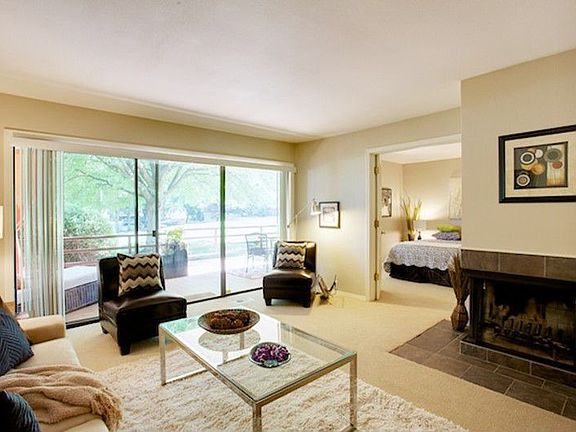Ground Level,truly a one level condo!Resort like setting with large covered patio surrounded by water feature and lush plants. Open kitchen with heated floors, large living area w/wood fireplace, french doors to the patio. Enjoy lifestyle of living on the River, walking path, restaurants, sailing, Willamette Park,(20' boat slip for sale $13,000)