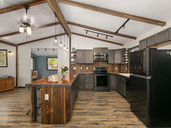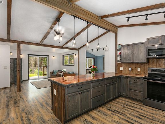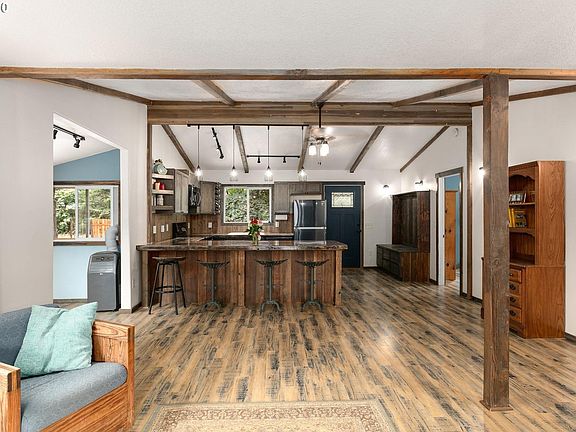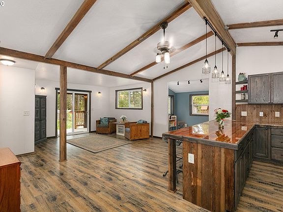 Beautifully remodeled 2 bdrm ranch on almost an acre in a peaceful & private setting. Exposed beam ceilings, & luxury vinyl plank flooring throughout. Kitchen has doug fir wood counter tops w/ brkfast bar, wood cabinets & black SS appliances. Vaulted living rm slider to back covered trex deck. Mster bdrm w/ceiling fan & 2nd bdrm. Shop w/one finished rm & bathroom. Shop has space for 4 cars, tractor, wood working tools and any toys you have!