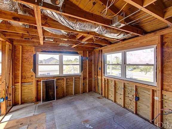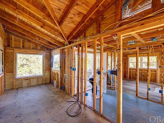 This home sits on 1/2 an acre that is zoned residential/commercial.Currently designed to be a duplex with 2 bedrooms, one full bath and a galley kitchen in each unit (with separate entrances) for a total of 4 bedrooms, 2 baths and 2 kitchens. This home is a great investment opportunity. Property meets the zoning duplex requirements and has an engineered firewall plan.Each apartment has its own electrical panel box and meter. The area under the house has been built to contain 3 partitions/separate entrances for 2 laundry rooms and one party kitchen for outdoor entertaining. 100% New electrical, 100% New plumbing, town water hook up, new GAF architectural roof, new cedar ship lap siding, new sheathing and paper, new doors and double hung windows, new cedar exterior trim, new decks and stairs, new piling foundation, new air handlers and ducts, located in the attic to make the design feel spacious inside and provides potential for EXCELLENT rental income. Having an unfinished interior also provides the opportunity for a buyer to make it their own or to easily convert this property back to a single family home. This LARGE 24,000 SqFt lot backs up to NC State land that will remain undeveloped, ensuring privacy and beautiful views and is just a 4 minute drive to ramp 49 for beautiful beach access! Additionally, being located on NC 12, this property is also a potential commercial opportunity! **See Associated Docs for a complete list of Seller Improvements.